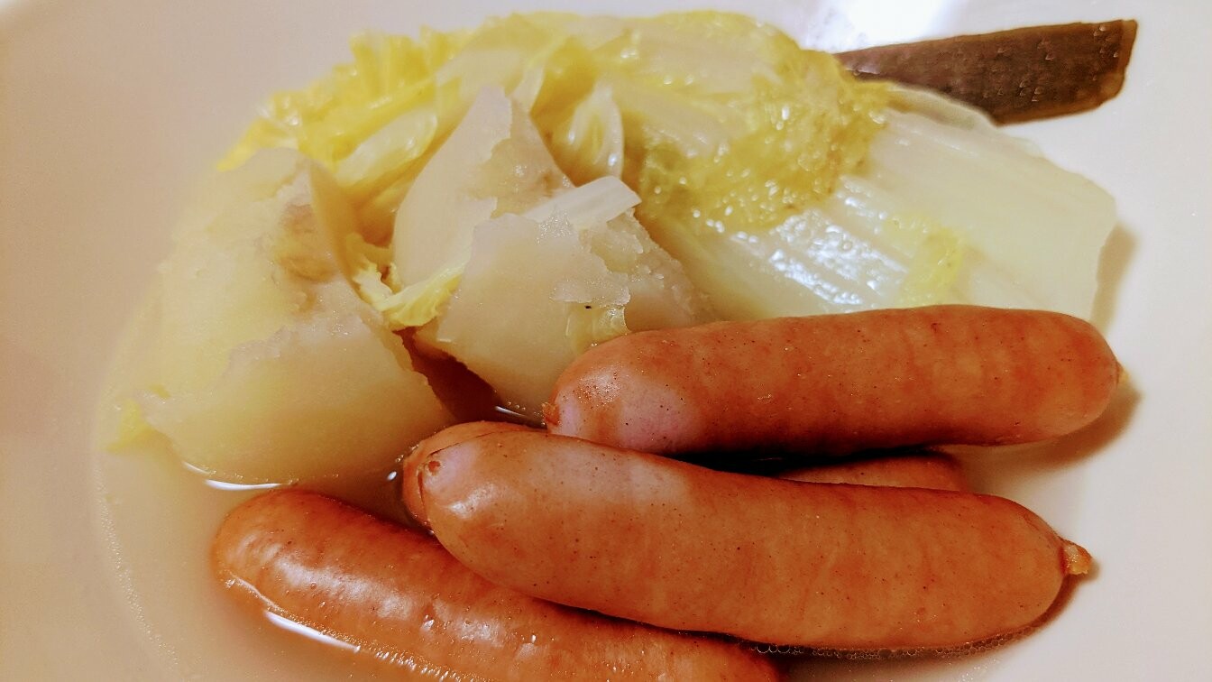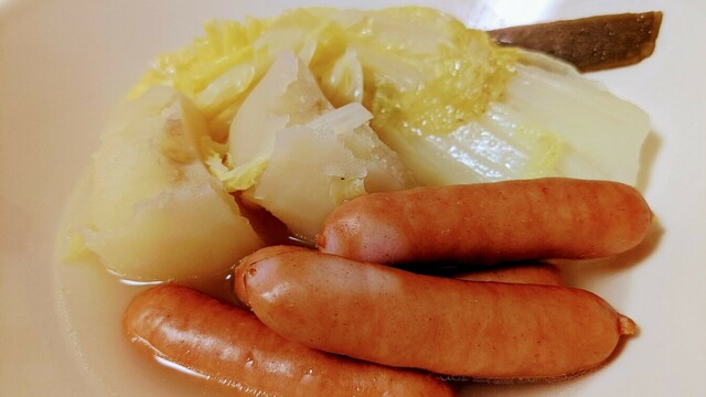 白菜、ウインナー、じゃがの昆布バターポトフ、長谷川あかりさんのレシピ。芋族なのでじゃがは倍量🥔 #自炊部