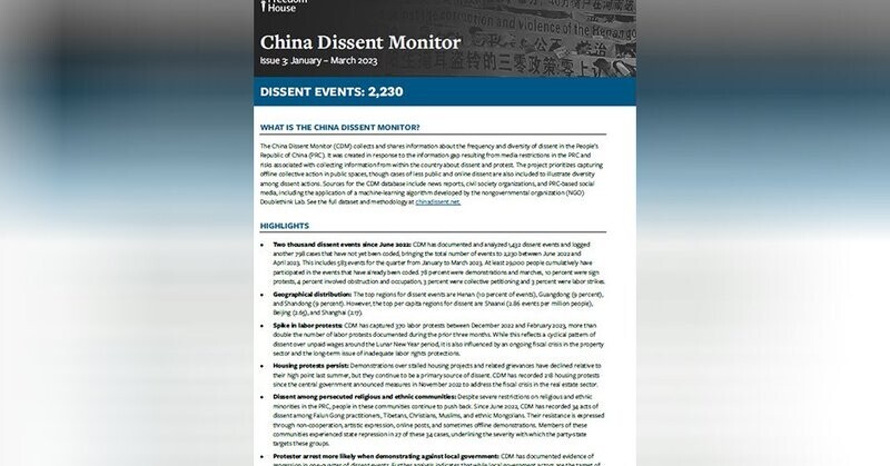 #自由之家: 2023年1月到3月之間,中國共發生了583起抗議事件,使 2022 年 6 月至 2023 年 4 月期間的事件總數達到 2,230 起,至少累計有29000人參與。 這些抗議事件其中78%是示威遊行,10%是舉牌抗議,4%是阻撓占領,3%是集體上訪,3%是罷工。 https://www.rfa.org/mandarin/Xinwen/4-06012023123724.html https://nitter.hongkongers.net/RFA_Chinese/status/1664349000978386944#m