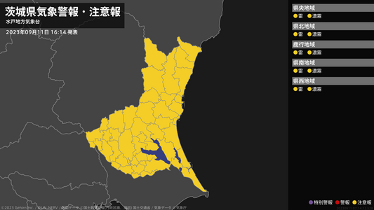 【茨城県 気象警報・注意報 2023年09月11日 16:14】