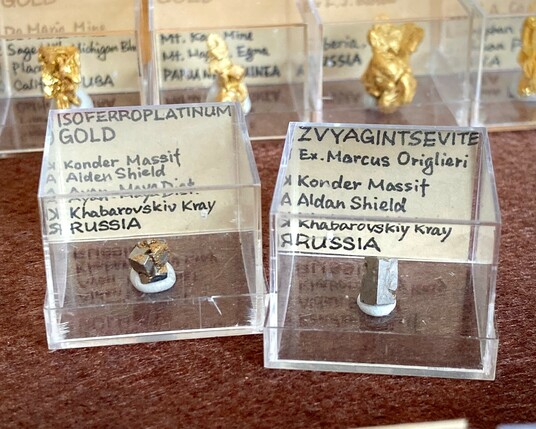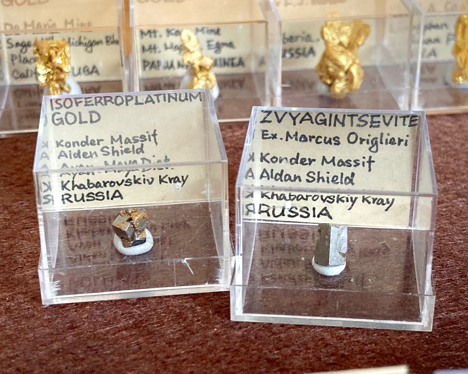 同样是来自俄罗斯卡巴罗夫斯基昆德尔铂金矿,等轴铁铂矿Isoferroplatium和等轴铅钯矿Zvyagintsevite都会长成银色的立方体小块块——只看形状的话真的很难区分二者。不过好在它们的密度差别足够大,前者高达18.41,后者“只”有13.32。