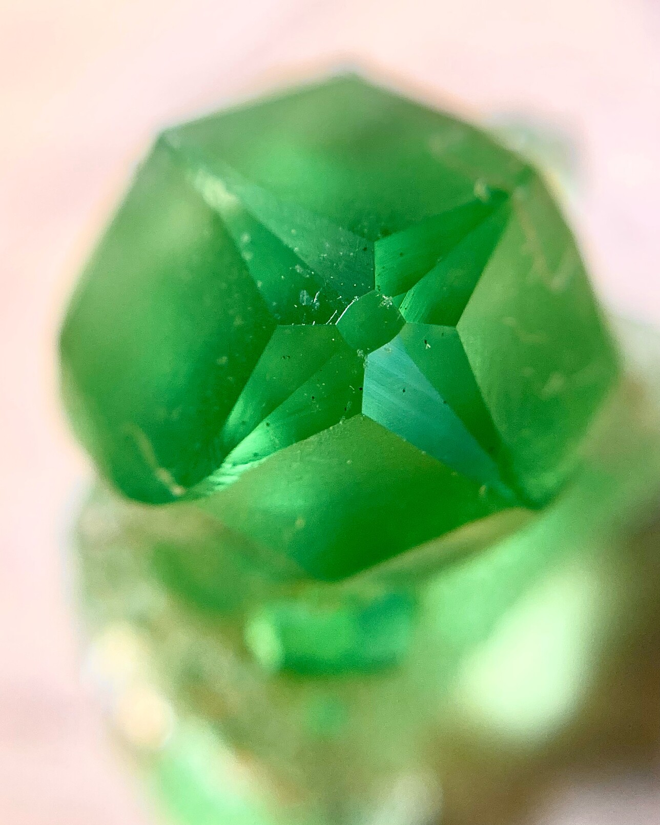 拍照的时候突然灵光一闪,想明白了这组六八面体是怎么长这样的——这一组hexoctahedron可能是萤石里更常见的{137}而不是石榴石里的那种{123},二者之间有一个小的倾角,因此它和菱形十二面体{011}的聚形不再是平行四边形,而是倾斜变形成了这样的小三角。(算了不会有人想知道这样的细节吧 :ageblobcat: