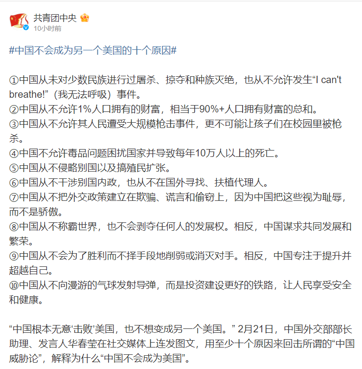 2月21日,中國外交部部長助理、發言人 #華春瑩 在推特上連發圖文,解釋 #為什麼中國不會成為美國。 2月23日,共青團中央將華春瑩推文翻譯整理後發微博:中國不會成為另一個美國的十個原因。 奇文共賞,請分享您的讀後感。 https://nitter.hongkongers.net/RFA_Chinese/status/1628823433646641154#m