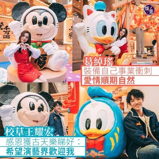 葛綽瑤裝備自己事業衝刺 愛情順期自然 校草王耀宏感恩獲古天樂睇好:希望演藝界歡迎我 銅鑼灣時代廣場聯同香港玩具品牌URDU,首度將迪士尼經典角色米奇與唐老鴨變身吉祥物----招財貓及達摩,展出Mickey Mouse & Donald Duck「招福開運慶典」。 #葛綽瑤 (Yoyo) 與「試當真」校草 #王耀宏 (Meaning)為活動拍廣告短片及宣傳照。... 農曆新年將至,談到來年的展望,Yoyo期待歌影視都有新的挑戰,坦言:「我今年24歲,想趁後生多點嘗試,希望可以拍攝旅遊及飲食節目,可以一邊開工、一邊開餐。知道自己仍然有很多不足,所以新一年會好好裝備自己,正在尋找適合的演技課程,希望可以有正統的演戲訓練。」 Yoyo強調來年的重點是發展事業,儘管她曾透露自己是「A4」,曾拍拖4次,但目前單身,笑指愛情順期自然。 校草Meaning去年參加真人騷出道,更獲古天樂睇好,成為廣告界新寵。他希望來年可以作多元化的發展,表示:「去年參賽都是想看看自己有沒有興趣做這一行,很感恩得...