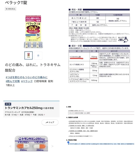 喉の痛みにはトラネキサム酸よりNSAIDsの方が効果的だと言われることも多いが、医師は喉の痛みにはトラネキサム酸を処方することがほとんど。医療用と量が異なるとはいえ、ペラックTも人気だ。