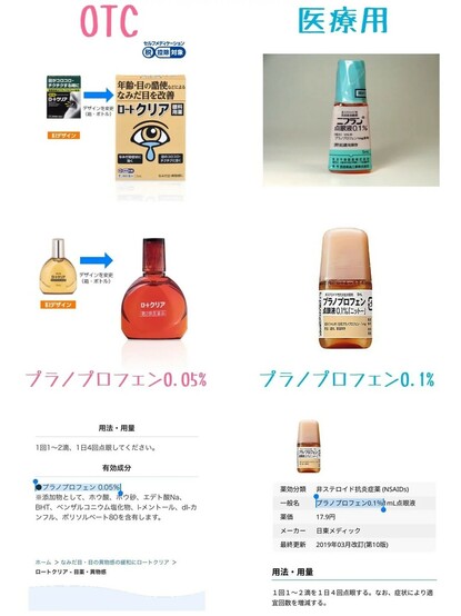 医療用で抗炎症剤として用いられているプラノプロフェン。OTCにもロートクリアなど同じ成分の目薬が存在している。