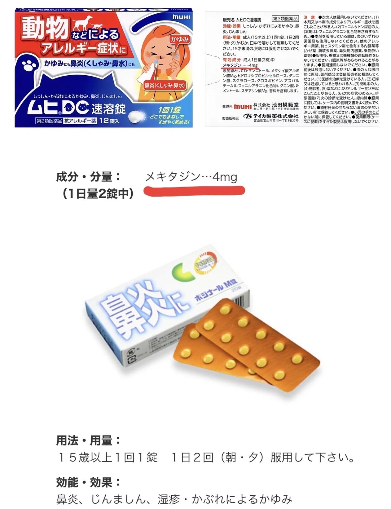 以前、ムヒDC速溶錠を買いに来たお客様なんだけど、既にポジナールM錠を服用中だった。1日メキタジン4mgという同じ(ような)薬。