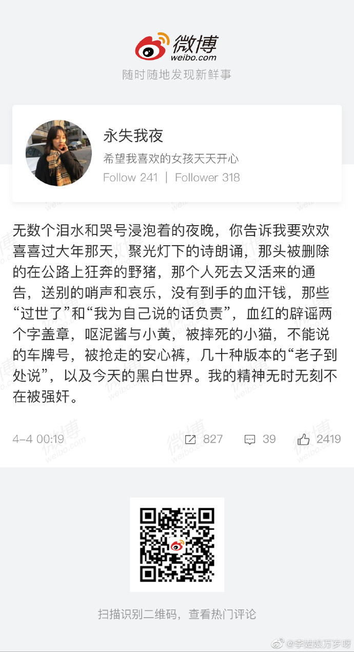日子卡得真不错,404,中央公园里悼念李文亮的人呢?陈秋实呢?那么多失业的人呢?那么多拿不到补贴的医生护士呢?那么多援建医院的工人呢?你也配哀悼,你配个几把。