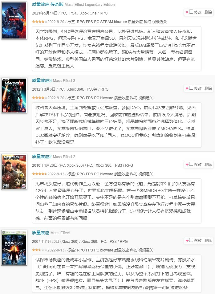 质量效应三部曲太好了,没玩过的强烈推荐去玩!太空歌剧!科幻史诗!队友不是扁平的符号而是有血有肉有故事的独立个体,和队友的互动特别有趣!女主武力强大字面意义上的拯救了银河系的同时还能和队友谈恋爱!LGBT friendly! 女主和小蓝莓贯穿三部曲的爱情故事太好嗑了(谁能想到2022年了最让我上头的是十几年前出的老游戏)