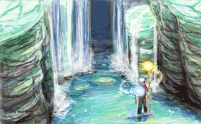 #pixivsketch #水 #赤服のピーターパン #ファンタジー #滝 #風景 #創作 #絵森