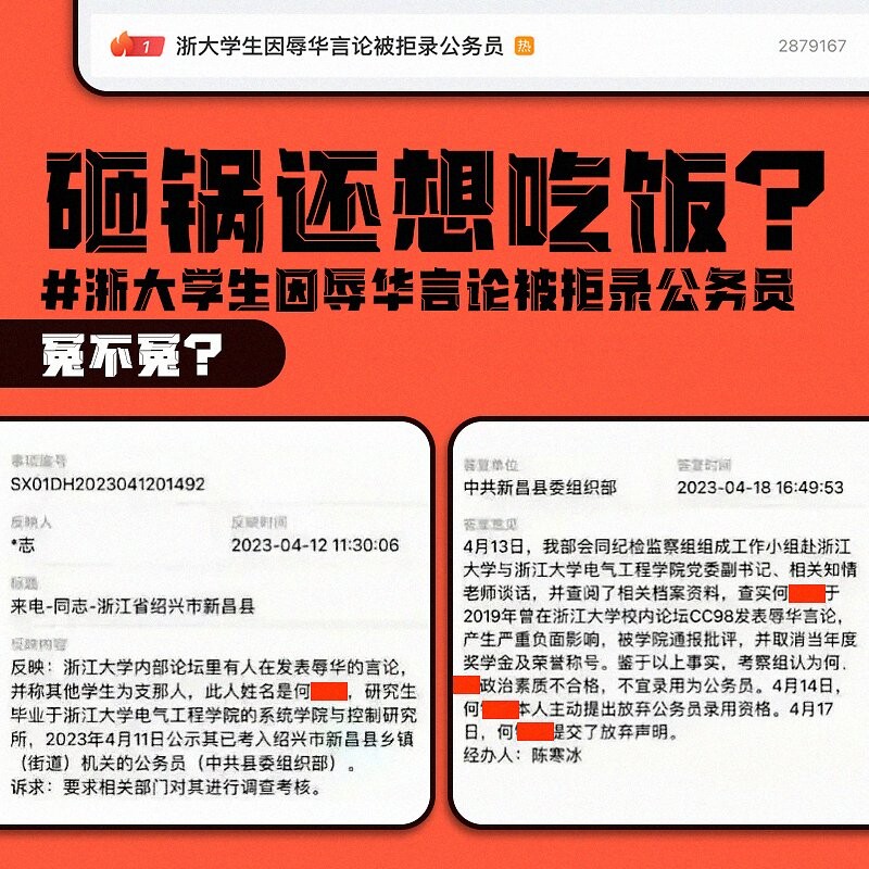 #浙大學生因辱華言論被拒錄公務員 登上微博熱搜 一浙大學生考上紹興市新昌縣鄉鎮(街道)機關公務員,公示期被舉報曾在學校論壇有 #辱華 言論 中共新昌縣委組織部調查認定政治不合格,不宜錄用。在4月21日網上視頻中,確認該生已主動放棄名額。 網友熱議:砸鍋還想吃飯? https://bit.ly/41QAEYC https://nitter.hongkongers.net/RFA_Chinese/status/1649540942196604930#m