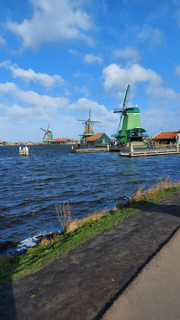 風車村始於1970年代,當時分佈於阿姆斯特丹北部的傳統房屋和多座風車經陸路和水路搬遷至贊河邊,後闢作旅遊景點。可能正因為毗鄰河畔,我們只能抵住強風,跨過橫跨贊河的小橋。
