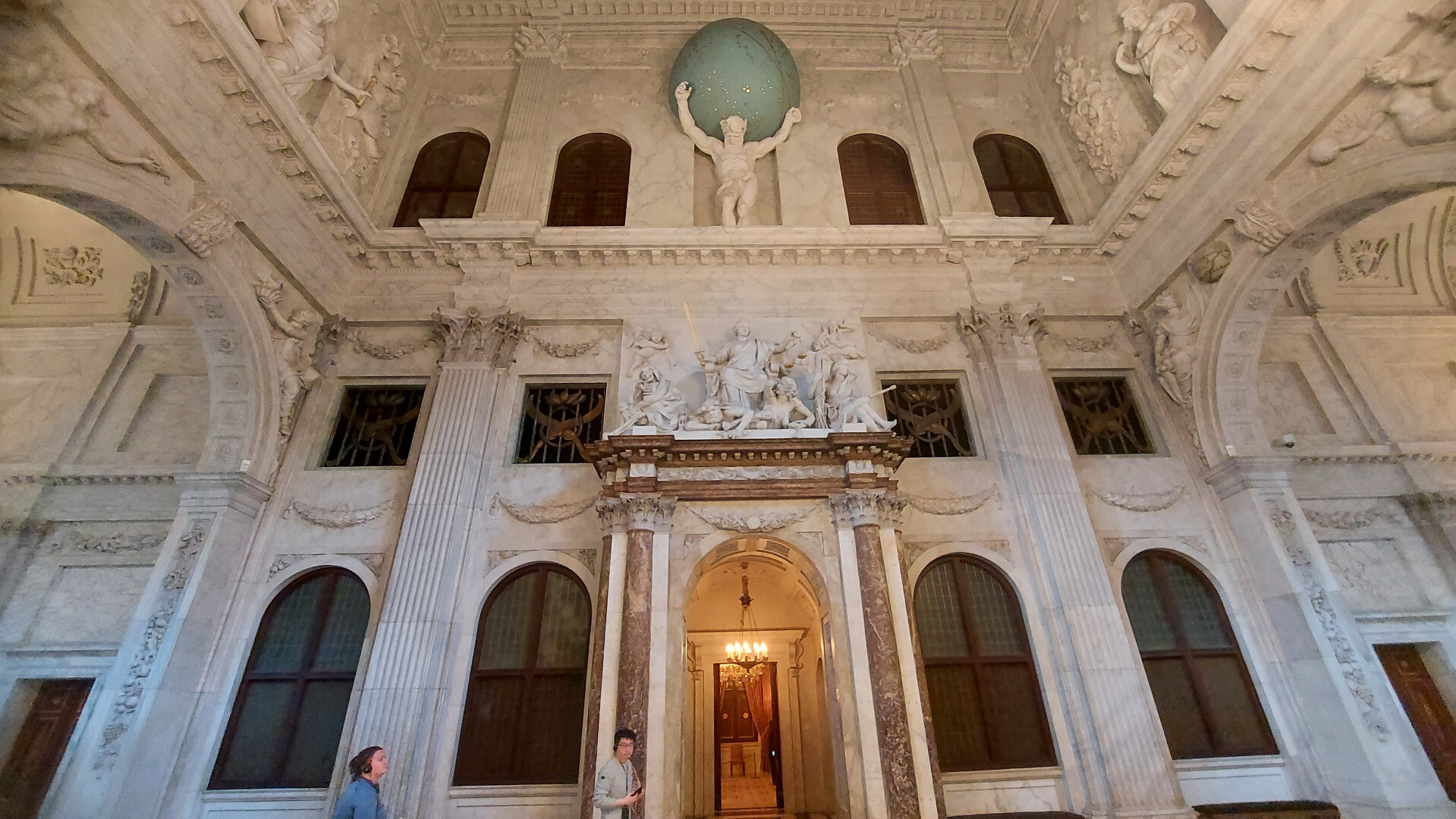 寬敞的市民廳是參觀的起點。市政廳中心的它兩端都有精緻的雕塑:映入眼簾的便是肩負星辰的阿特拉斯像(圖一);相對的是阿姆斯特丹女神,象徵這首都不但掌管地上四海,更是宇宙中心(圖二)。掃視地上的世界地圖和週遭樑柱,我反而聯想到舊時代的銀行櫃枱:雍容華貴的男女靠向兩旁木製櫃位,隔着雕花的柵欄,向行員遞上鈔票。