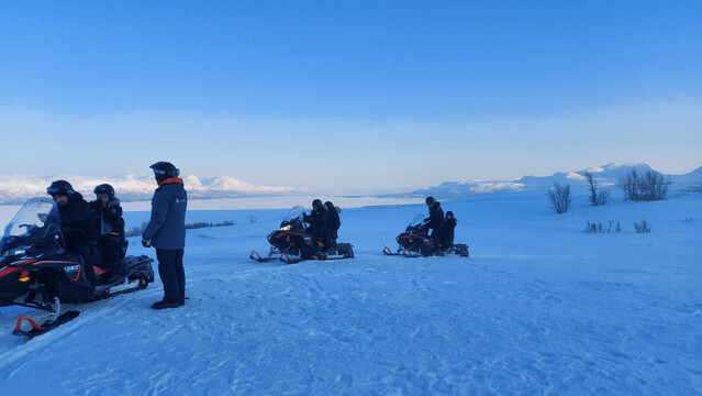 翌日下午,我們又跟隨另一團,乘着雪上電單車(圖五),在旅館附近的山谷探索。即使我們都沒有駕駛執照,於後座穿梭於雪山之間也別有一番滋味—尤其在高速馳騁的時候,電單車濺起一點點冰雪,即使面前有擋風玻璃和頭盔遮擋也感受到一點點冰凜。坦白説,在一層層的白雪圍繞下,週遭眾山其實看似一體,令人分不清位置和方向(圖六);但停下來細細觀賞,只見山丘披上了一層灰藍的漸層(圖七八),在萬里無雲的天空之下,恬靜的感覺油然而生。不確定的感覺隨導遊送上的熱飲融化,留下的只有對接下來的旅程的嚮往和期待。