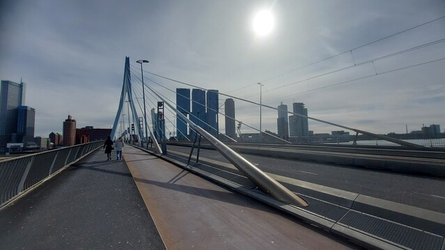 從海事博物館漫步十多分鐘,便是連接鹿特丹南北兩端的伊拉斯謨大橋。大橋於1996年開通,長800米,藍白色的結構甚至有天鵝的美稱(圖一)。不過比起事後搜尋的各種細節,我正在藍天白雲下,努力捕捉對面更古典的威廉士大橋的美態(圖二)。如落日般泛紅的橋身,正好與正午的天空相映成趣。
