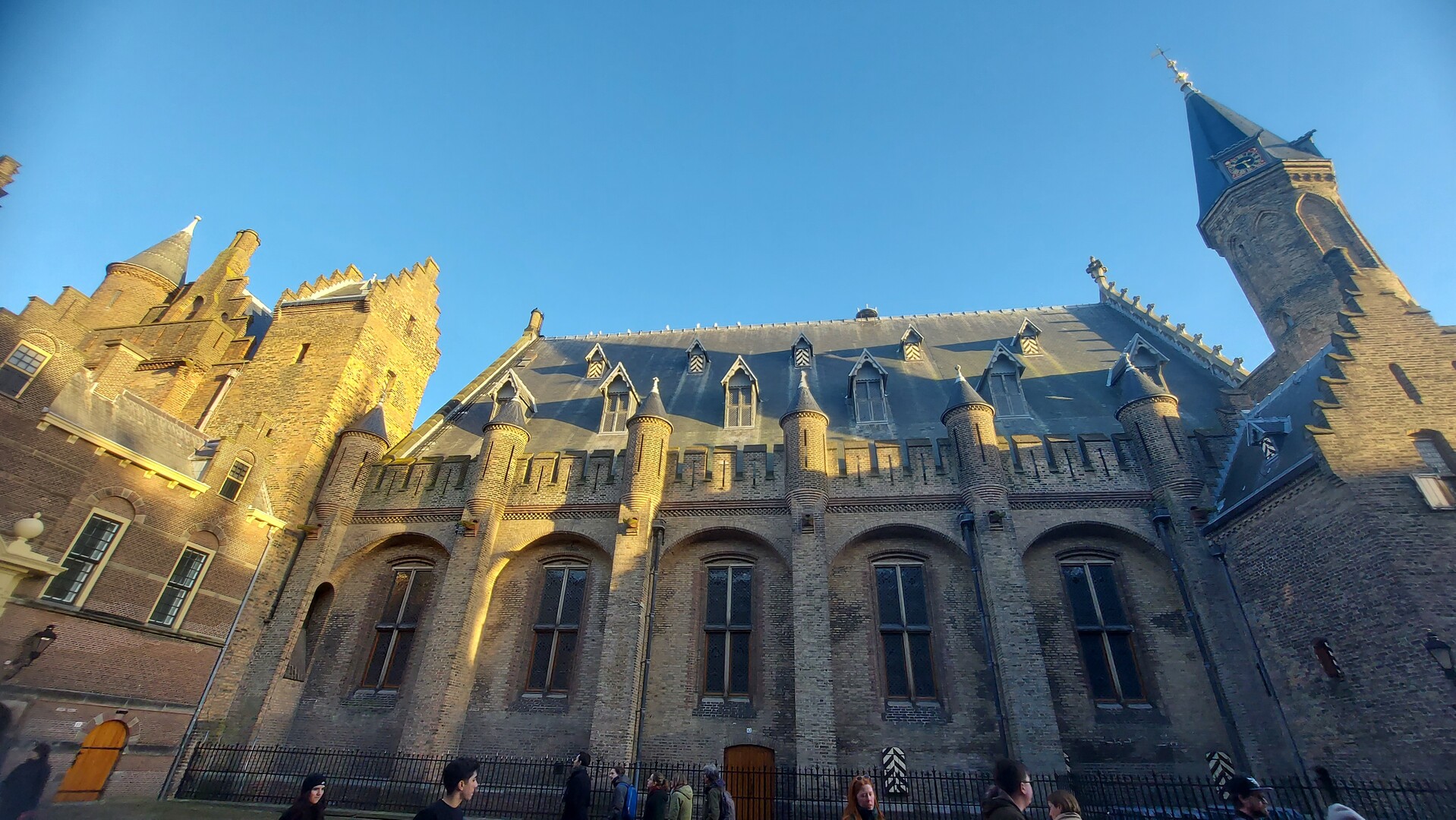美術館後方就是第一站:國會議事堂中庭。這片空地自十五世紀便是荷蘭政治中心:現今不但是上議員唇槍舌劍的論壇,也是首相辦公室,甚至成為民選下議院的兵家必爭之地。較知名的,是每年國會會期開始時國王演説的騎士廳;可惜國會正在翻新,大部分的空地被封閉,只能找一個圍欄不會入鏡的角度拍照(圖一)。