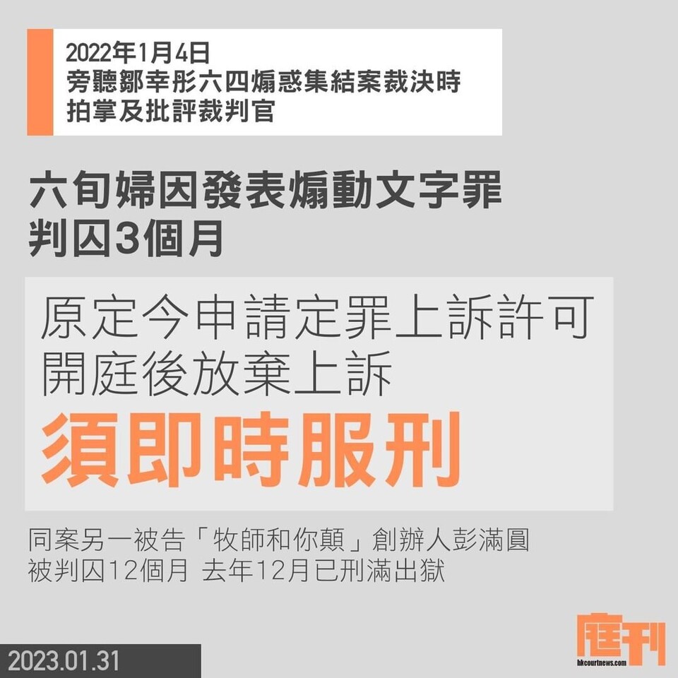 一男一女「#旁聽師」被指在去年年初,在法院旁聽前支聯會副主席 #鄒幸彤 #煽動參與六四集結 案裁決時,在庭上拍掌及批評裁判官,兩人否認控罪,受審後在去年10被裁定發表煽動文字等罪成,分別被判囚12個月及3個月,為首宗涉及法庭旁聽者違反煽動罪的案件。案中六旬婦人不服定罪裁決,原定今(31日)向高等法院就定罪提出上訴,惟她今透過法律代表向法庭表示放棄上訴,並撤銷上訴申請,獲法官黎婉姫批准,下令她須即時服刑。有旁聽人士就在散庭後向她輕呼:「保重!」