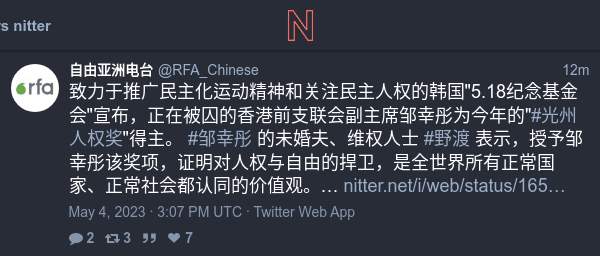 致力於推廣民主化運動精神和關注民主人權的韓國"5.18紀念基金會"宣布,正在被囚的香港前支聯會副主席鄒幸彤為今年的"#光州人權獎"得主。 #鄒幸彤 的未婚夫、維權人士 #野渡 表示,授予鄒幸彤該獎項,證明對人權與自由的扞衛,是全世界所有正常國家、正常社會都認同的價值觀。… https://twitter.com/i/web/status/1654140722088476676 https://nitter.hongkongers.net/RFA_Chinese/status/1654140722088476676#m