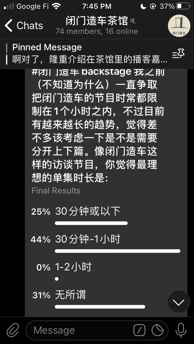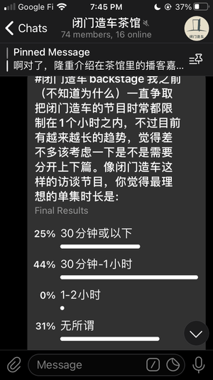 前几天的投票出结果了,长毛象和闭门造车茶馆的大家,意见意外地一致,都偏向30-60分钟区间。那时间比较长的下一期就分成上下两篇发布好了~摩拳擦掌~ #闭门造车backstage