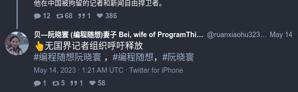 @changchengwai RT by @badiucao: 如没记错,贝女士最后的推文中与推友互动的话题是,设想在马斯克到上海时,呼吁他为 #编程随想 #阮晓寰 发声 https://nitter.hongkongers.net/changchengwai/status/1666139496557969412#m