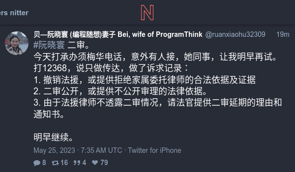 @ruanxiaohu32309 RT by @badiucao: #阮晓寰 二审。 今天打承办须梅华电话,意外有人接,她同事,让我明早再试。 打12368,说只做传达,做了诉求记录: 1. 撤销法援,或提供拒绝家属委托律师的合法依据及证据 2. 二审公开,或提供不公开审理的法律依据。 3. 由于法援律师不透露二审情况,请法官提供二审延期的理由和通知书。 明早继续。 https://nitter.hongkongers.net/ruanxiaohu32309/status/1661637095872671744#m