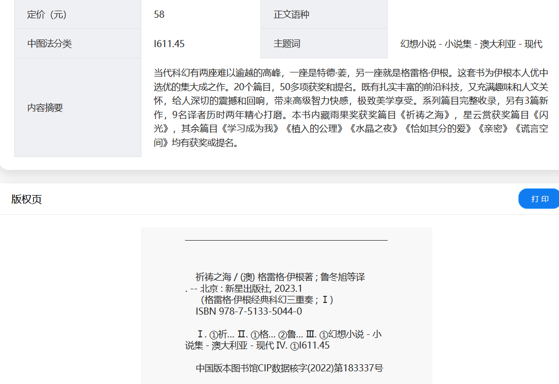 #新書消息 #陆版 #科幻小說 祈祷之海 / (澳) 格雷格·伊根著 ; 鲁冬旭等译. -- 北京 : 新星出版社, 2023.1 (格雷格·伊根经典科幻三重奏 ; Ⅰ) ISBN 978-7-5133-5044-0 Ⅰ. ①祈… Ⅱ. ①格… ②鲁… Ⅲ. ①幻想小说-小说集-澳大利亚-现代 Ⅳ. ①I611.45 中国版本图书馆CIP数据核字(2022)第183337号