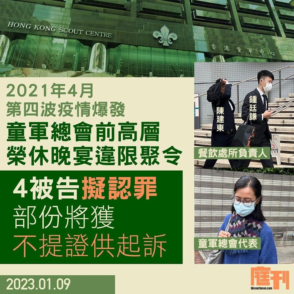 香港童軍總會2021年4月在尖沙咀香港童軍中心為一名前高層舉行榮休晚宴,涉嫌違反 #限聚令。 #香港童軍總會 及涉事酒樓被票控,早前否認控罪,案件原訂今(9日)在九龍城裁判法院開審,惟甫開庭,控辯雙方表示就被告擬認罪有事商討,押後至明天才答辯。