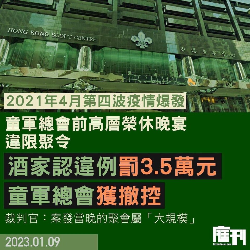 #香港童軍總會 2021年4月在尖沙咀 #香港童軍中心 為一名前高層舉行榮休百人晚宴,涉嫌違反 #限聚令。事件被傳媒揭發後,香港童軍總會及涉案酒樓等被票控,早前一度否認控罪,控方今(10日)在九龍城裁判法院撤銷童軍總會及酒樓職員的傳票控罪,涉事酒樓則承認兩項控罪,罰款3.5萬元。酒樓店長的控罪則以2000元簽保守行為12個月處理。