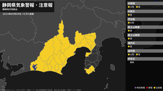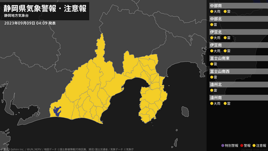 【静岡県 気象警報・注意報 2023年09月09日 04:09】中部、伊豆、西部では、9日昼前まで土砂災害に注意してください。静岡県では、9日昼前まで落雷に注意してください。#気象警報注意報 #静岡県