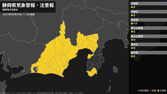 【静岡県 気象警報・注意報 2023年09月09日 11:38】伊豆では、9日夕方まで土砂災害に注意してください。中部、東部、西部では、9日夕方まで落雷に注意してください。#気象警報注意報 #静岡県