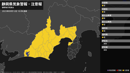 【静岡県 気象警報・注意報 2023年09月12日 04:52】伊豆では12日昼前まで、中部、東部、西部では12日夜遅くまで、竜巻などの激しい突風や急な強い雨、落雷に注意してください。#気象警報注意報 #静岡県