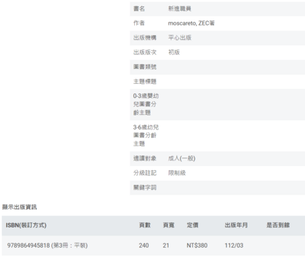 #新書消息 #台版 #韓耽漫畫 書名 新進職員 作者 moscareto, ZEC著 出版機構 平心出版 出版版次 初版 適讀對象 成人(一般) 分級註記 限制級