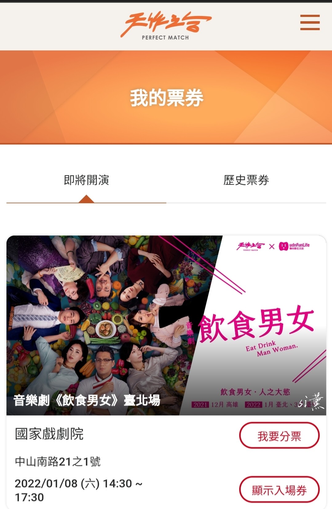 我很喜歡音樂劇,這次天作之合的音樂劇「飲食男女」,很吸引我,訂票後,我才知道原來我之前有看過一場「天堂邊緣」,原來也是他們的作品,當時看得熱淚盈眶,期待這次的音樂局。
