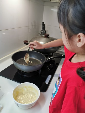 姐姐某天看到我買回來的鬆餅粉,便自告奮勇的說隔天早上她想煎鬆餅當早餐。雖然煎了快半小時,媽媽肚子好餓,然後最後還是語帶驚恐的跟我說,鍋子好熱,媽媽幫我。但是這是姐姐第一次作早餐給我吃,就算煎到燒焦,媽媽還是覺得好香好好吃 :)