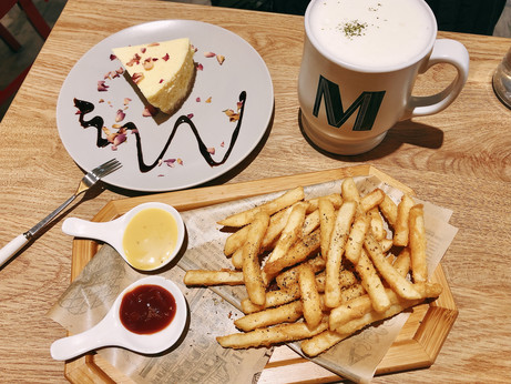 平時多半會來吃正餐,消費滿 200 元積 1 點(記載他們的會員系統中)。今天特地來消耗點數,8 點可兌換如照片上半部所示的下午茶組合(蛋糕+飲料),我又加點了一盤脆薯。