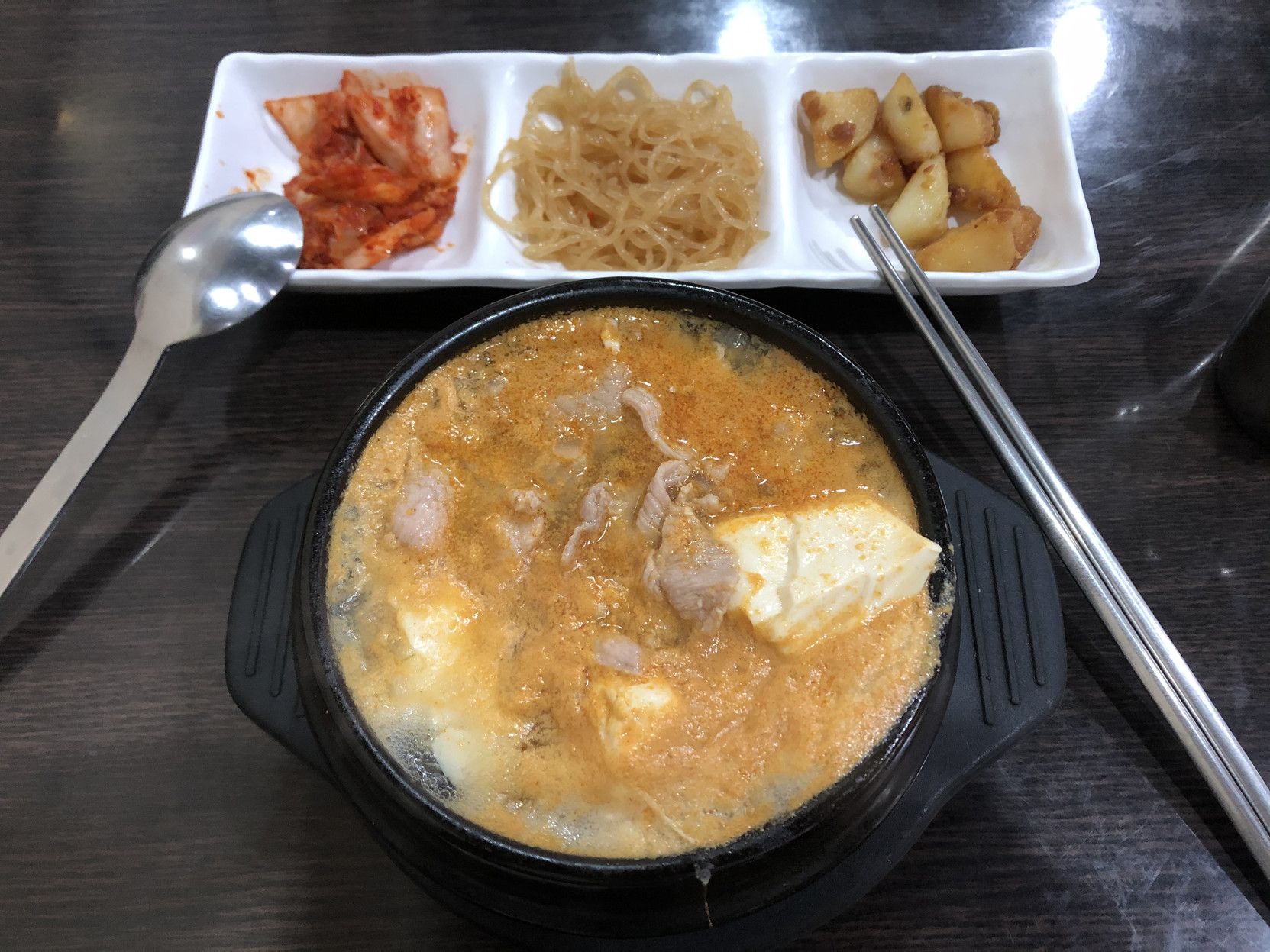 坐定,會先上一壺水(是冰水or溫水視天氣而定),以及很有韓式風味的小鋼杯(忘了拍);走平價路線,價格大約是比一個傳統便當再高上一些,隨餐附的小菜可以續一次。