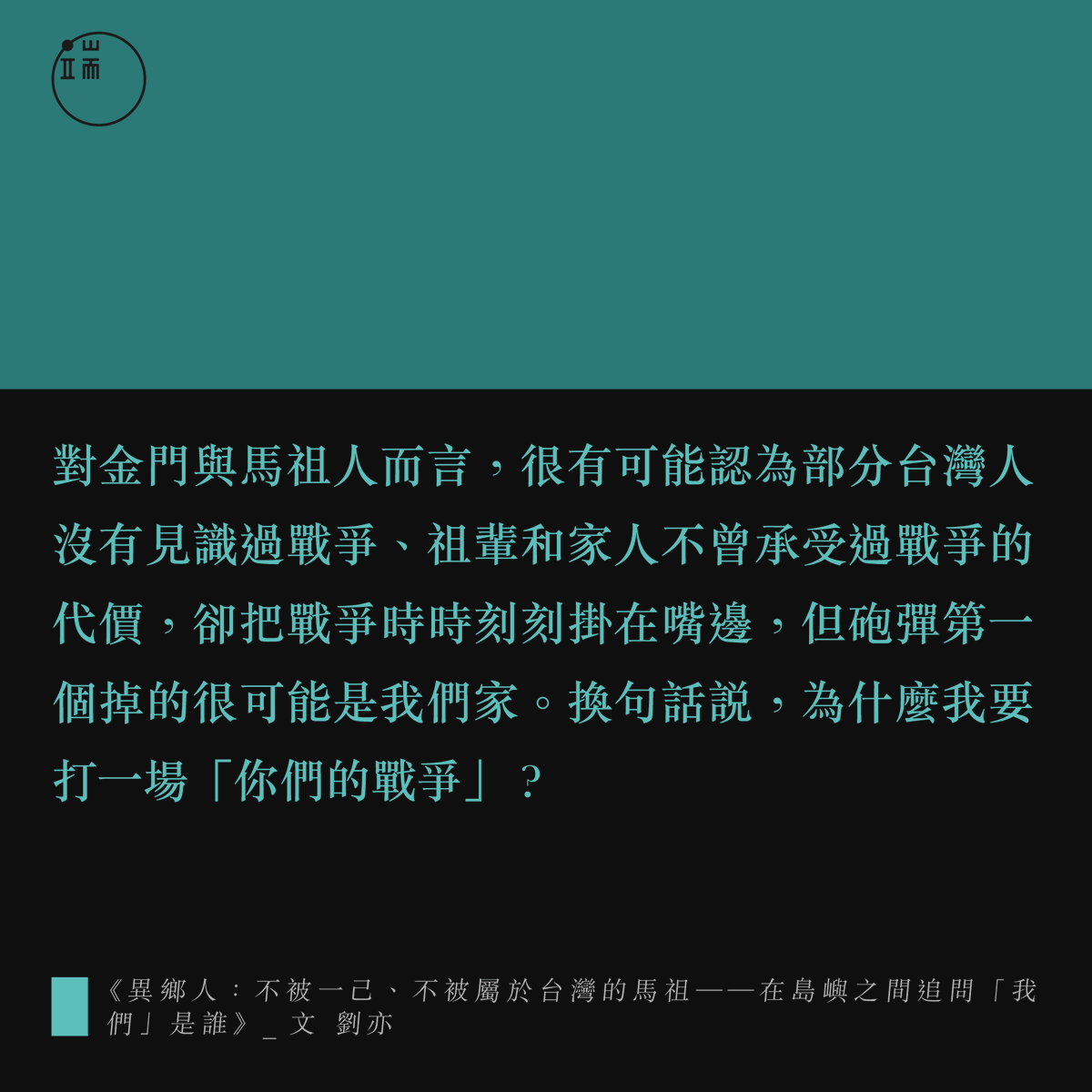 【被部分台灣人猜忌「通共」的前線 #馬祖,會「為台灣而戰」嗎?】http://bit.ly/3SQBZvu 面對戰爭,許多台灣人總不乏熱血沸騰。對金門與馬祖人而言,很有可能認為部分台灣人沒有見識過戰爭、祖輩和家人不曾承受過戰爭的代價,卻把戰爭時時刻刻掛在嘴邊,但砲彈第一個掉的很可能是「我們家」。 https://nitter.hongkongers.net/initiumnews/status/1631565076330053633#m