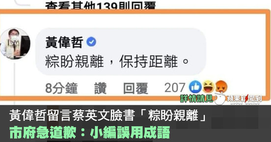 黃偉哲留言蔡英文臉書「粽盼親離」  市府急道歉:小編誤用成語