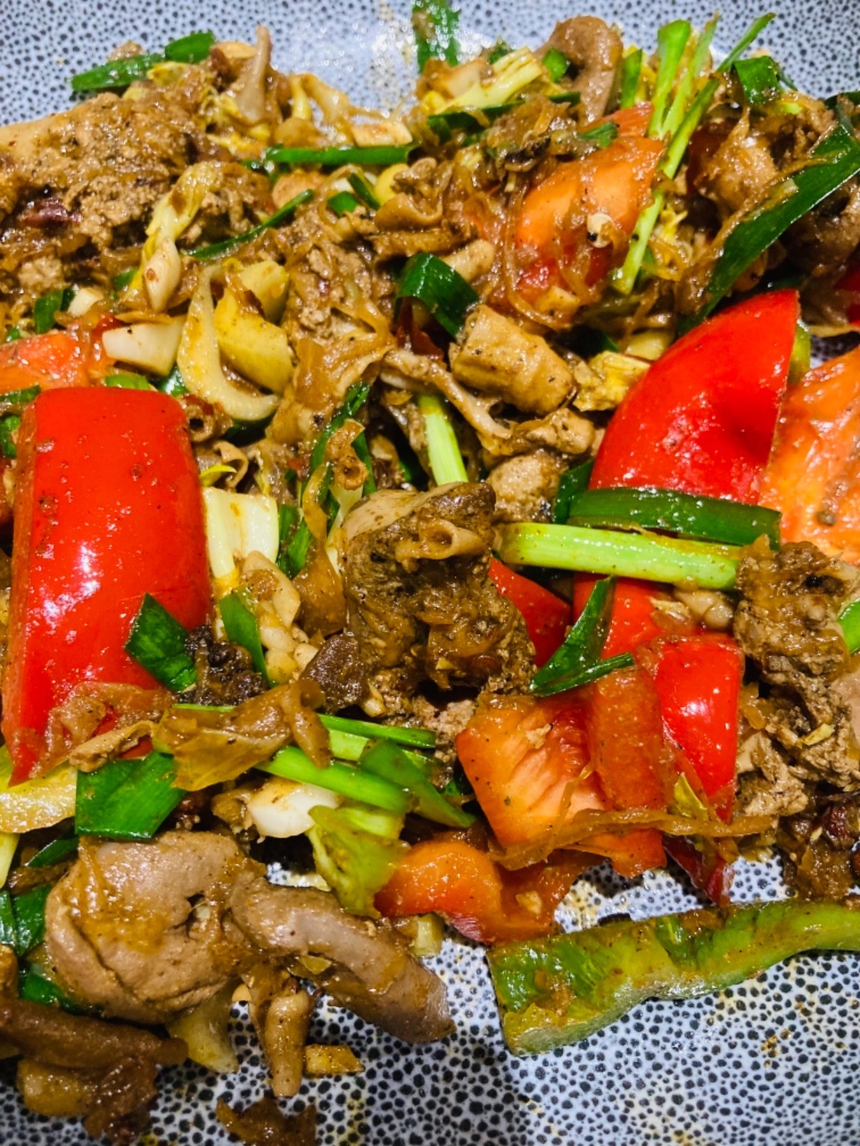 随便炒点鸭杂吃(鸭肝鸭心鸭胗鸭肠),配菜东一榔头西一棒子抓到什么是什么,总之要红配绿,漂亮(你)波兰酸菜总吃不完就也放进来了。今天买的韭菜很好,吃完这一盘忍不住又炒了韭菜炒胡萝卜吃掉。