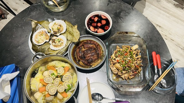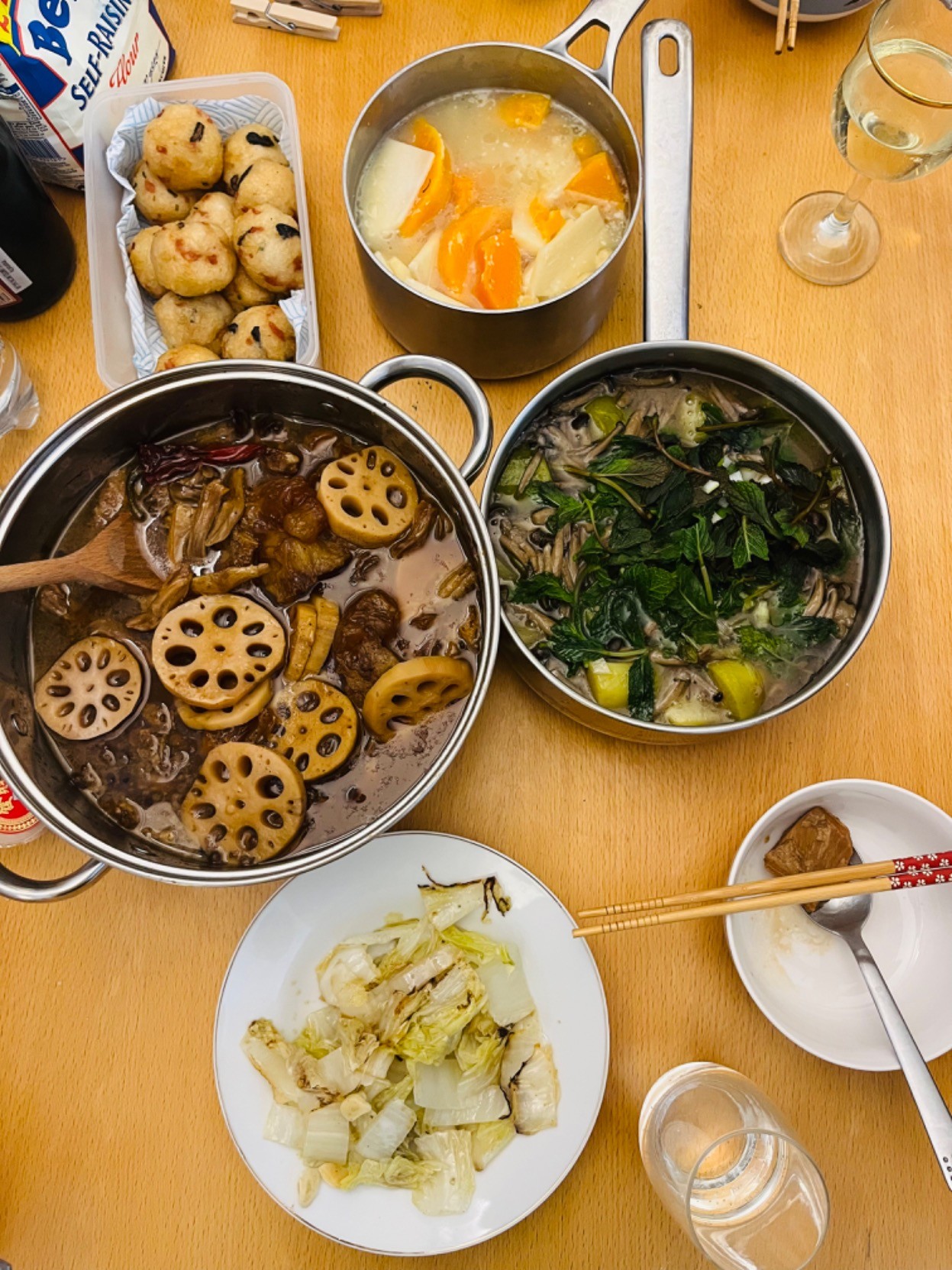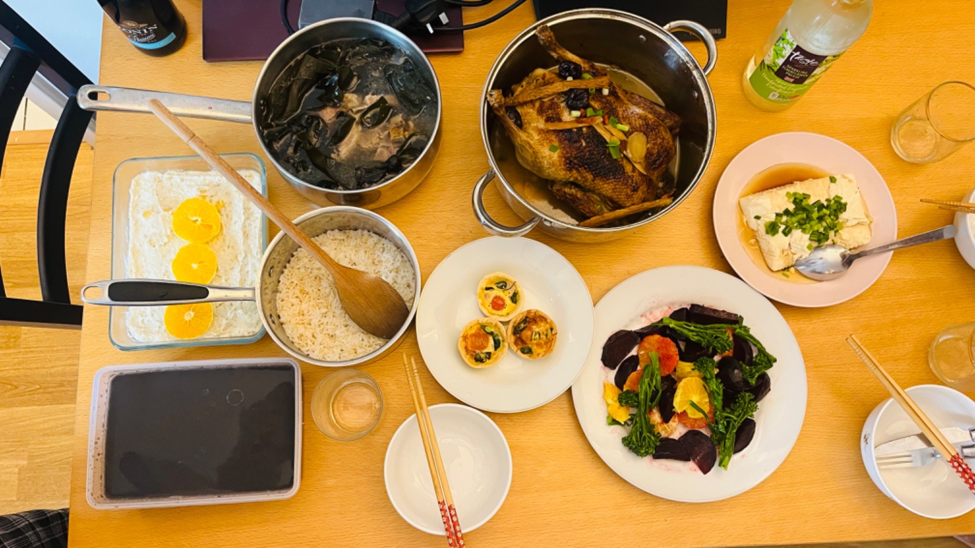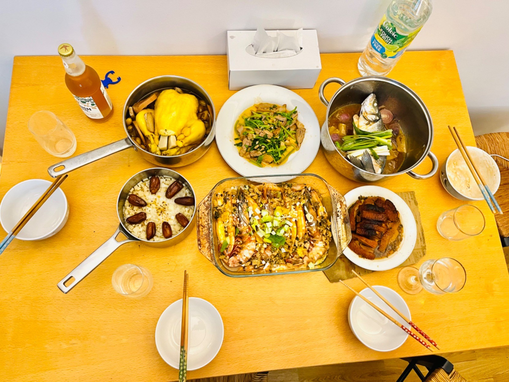吃了 :0180: 八宝鸭可以再嫩一点不过味道复刻得不错!没买冬瓜所以做了海带骨头汤,感觉这一桌本来也需要一点海的味道……友友们带了黑芝麻糊、 quiche 和饮料 :ablobcatheartsqueeze: 吃完饭一起出门逛街感觉精神非常卫生 :ablobcatheartsqueeze: