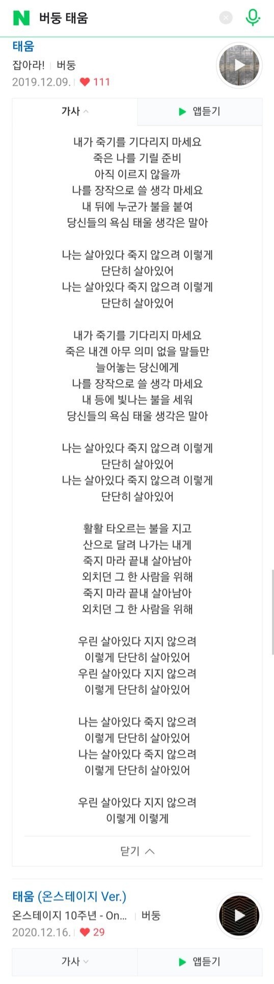 "나는 살아있다, 죽지 않으려 이렇게 단단히 살아있어, 우린 살아있다, 지지 않으려 이렇게, 이렇게"