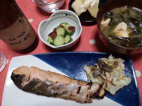 冷凍庫で眠らせていた秋鮭を塩麹漬で。あとしめじサイズのヒラタケはキャベツと炒めたよ〜。