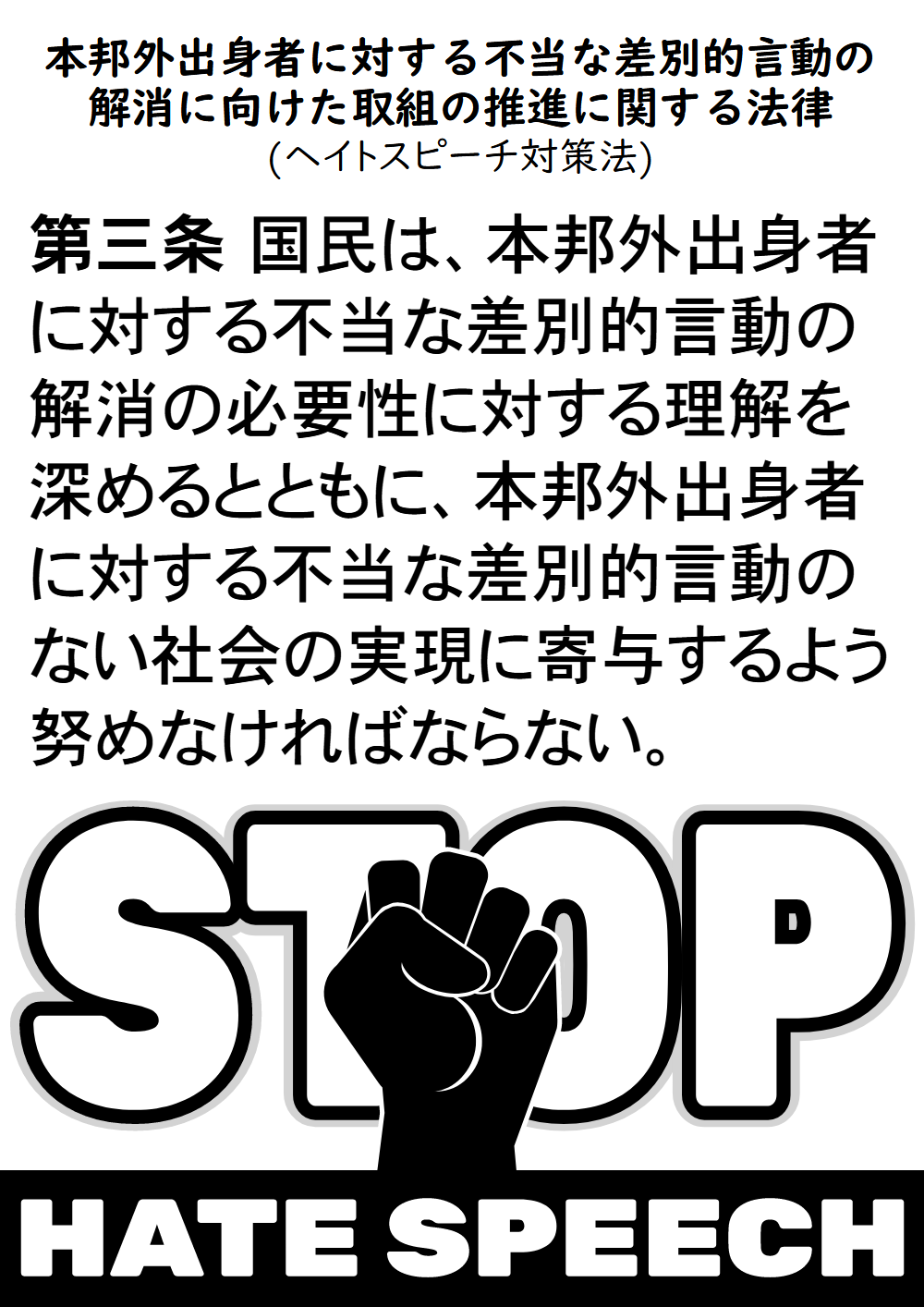 ヘイトスピーチ対策法(解消法)の条文をプラカード風に仕立てた文書をネットプリントに登録しています。モノクロにつきA3判でも1枚20円で印刷できます。