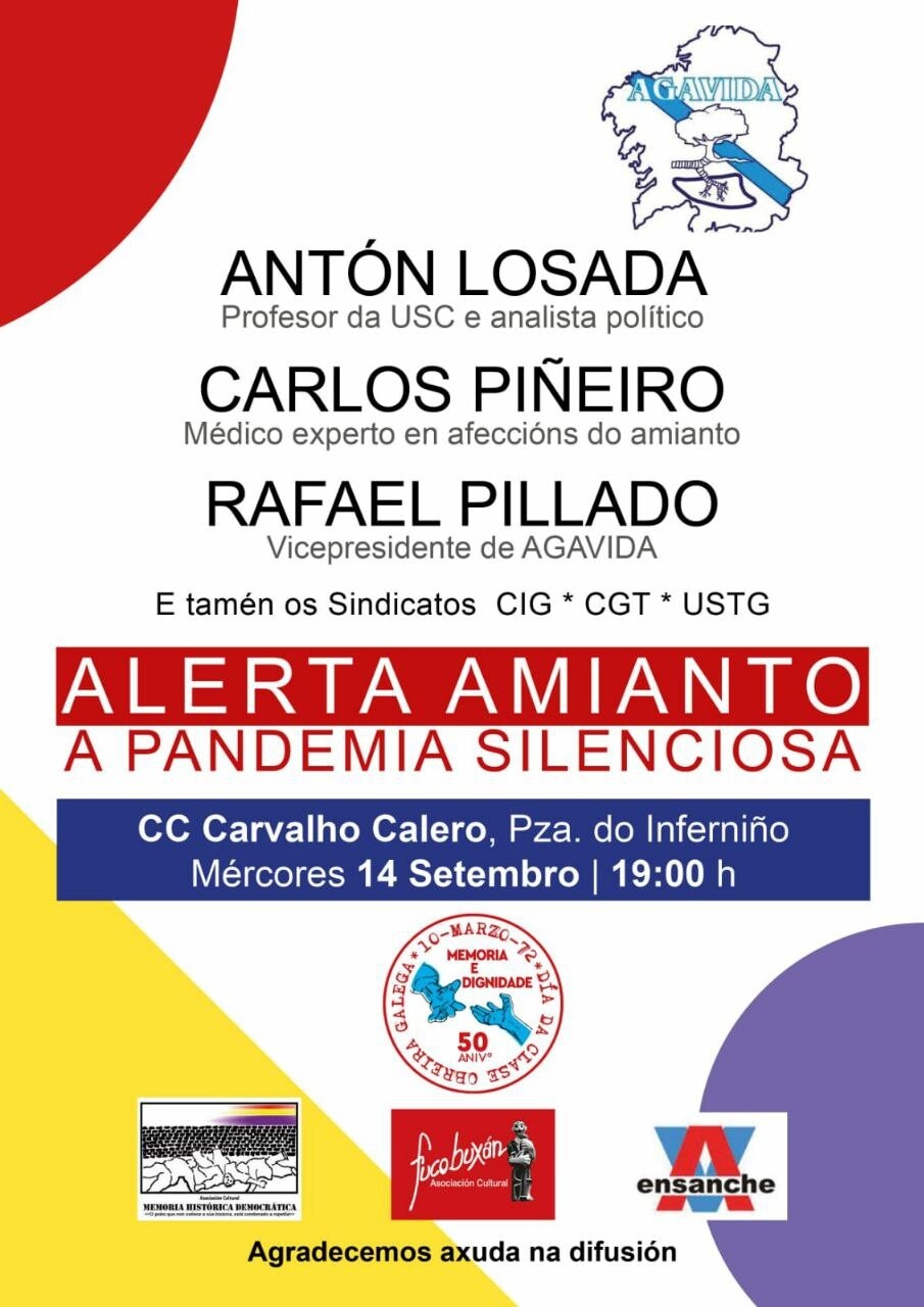 📣📆 #14S #Ferrol | Palestra sobre como o desprezo cara a vida dos obreiros provocou que miles falecesen por manipular amianto. Falarán Antón Losada, o médico especialista Carlos Piñeiro e Rafael Pillado, enfermo de cancro polo amianto.