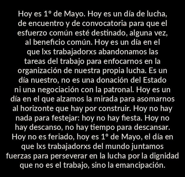 La Federación Obrera Regional Argentina (F.O.R.A.) bajo el lema “HOY NO ES FERIADO” invita a trabajadorxs, organizaciones, medios de comunicación y público en general al acto del 1° de Mayo en Plaza Once (Ciudad Autónoma de Buenos Aires).