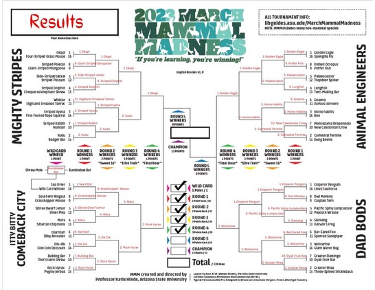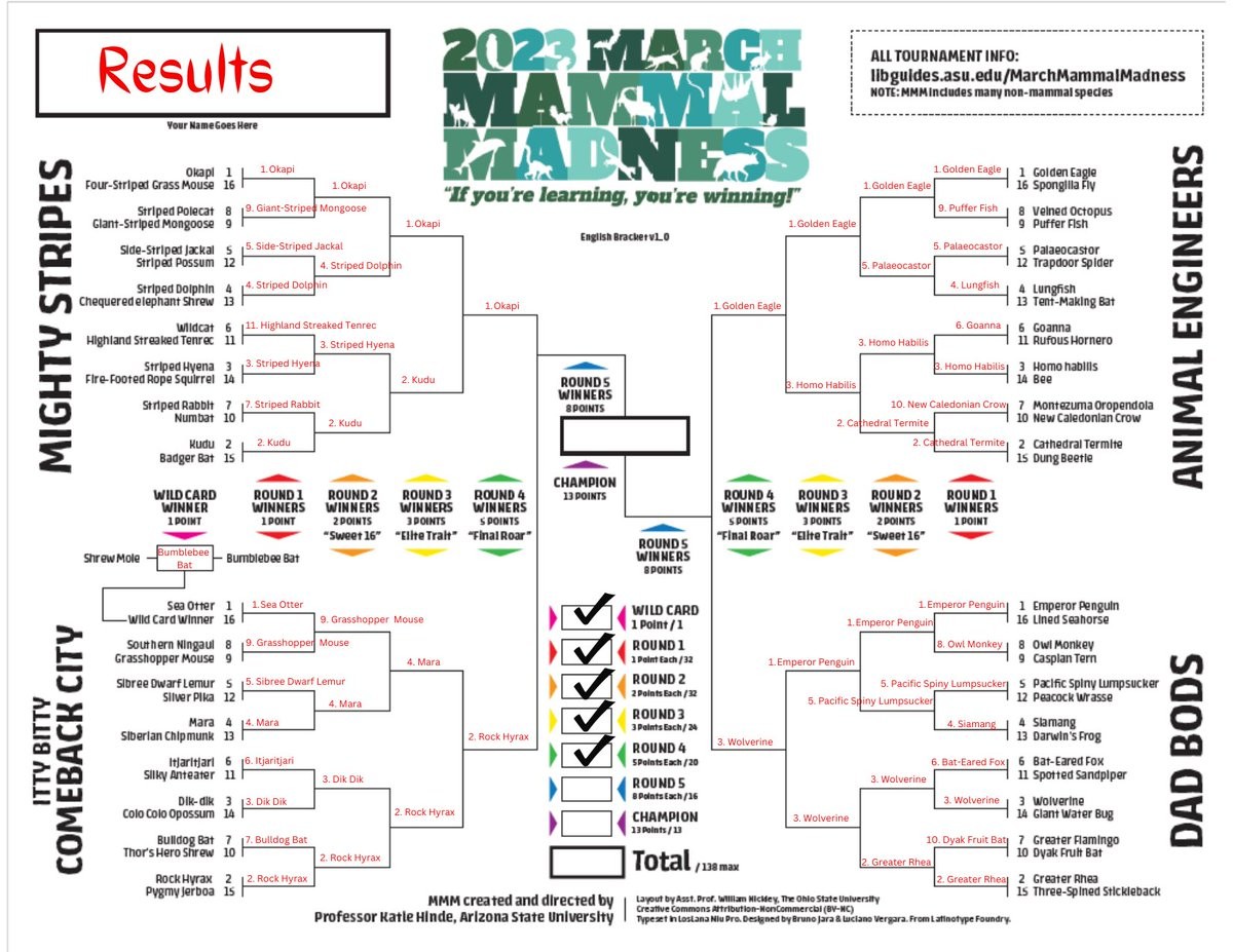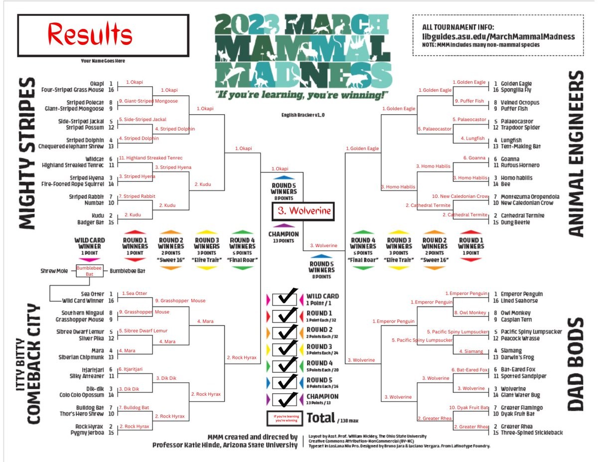 Winners of the Elite Trait: OKAPI, WOLVERINE, GOLDEN EAGLE, and ROCK HYRAX! Join us MONDAY April 3rd at 8PM E for the FINAL ROAR! #2023MMM