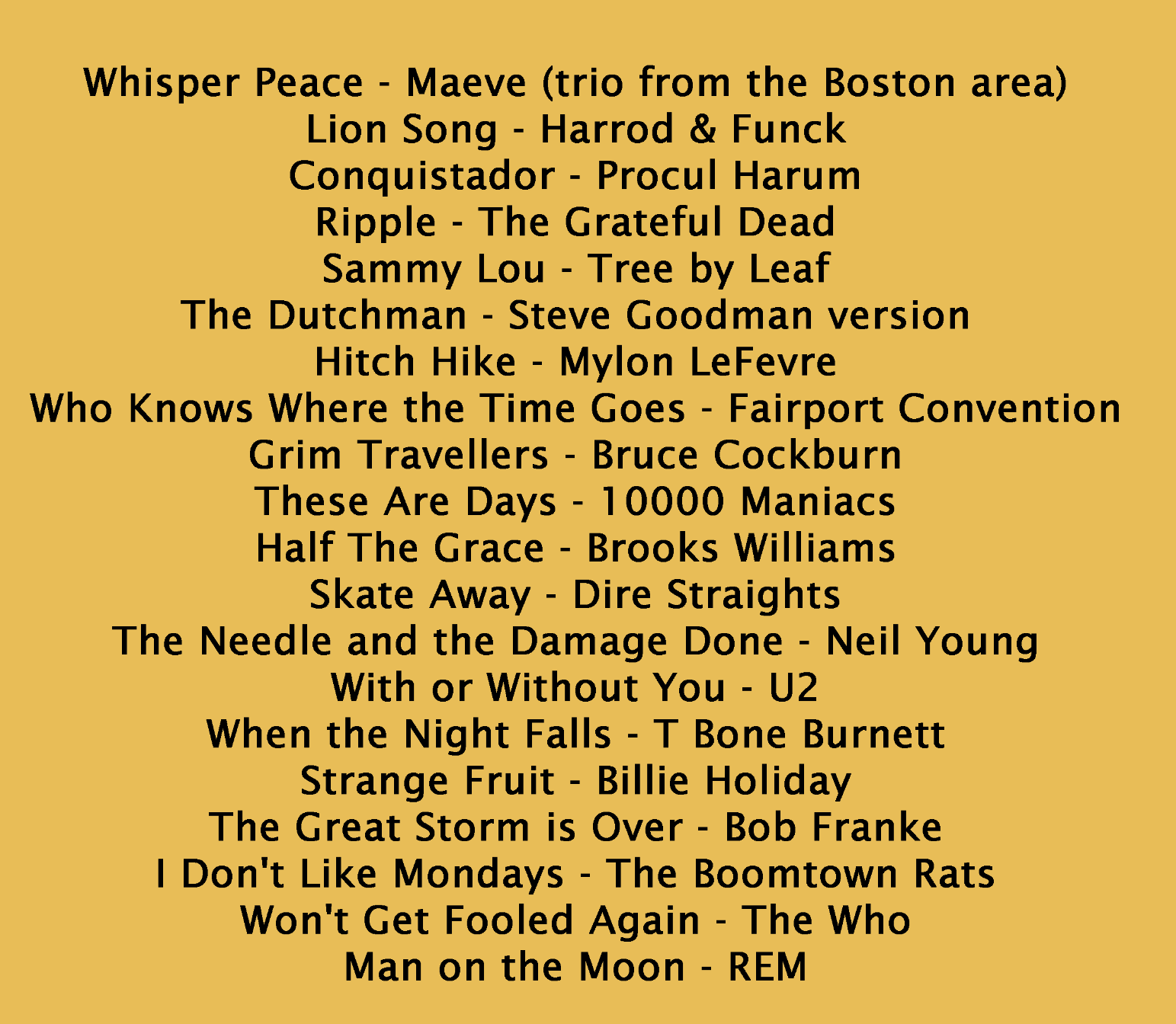 Create a 20 song list of favorites. Not the best songs; the ones that bring instant joy the second you hear the first note, the ones that give other people the best insight into what stirs your soul. Only one song per artist.