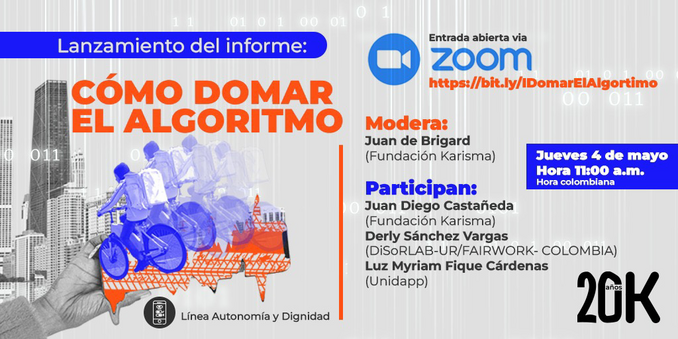 La fundación @Karisma lanzará su informe sobre gestión algorítmica en las plataformas de reparto digital (como @RappiColombia ). Estoy invitada a participar como parte del @TowardsFairWork Colombia. :blobfoxdealwithitfingerguns: