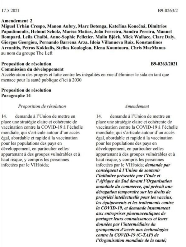 Si chiede all'🇪🇺 di appoggiare la richiesta di 🇿🇦 e 🇮🇳 e sostenere la sospensione dei #brevetti su vaccini, macchine e cure contro il #Covid_19.