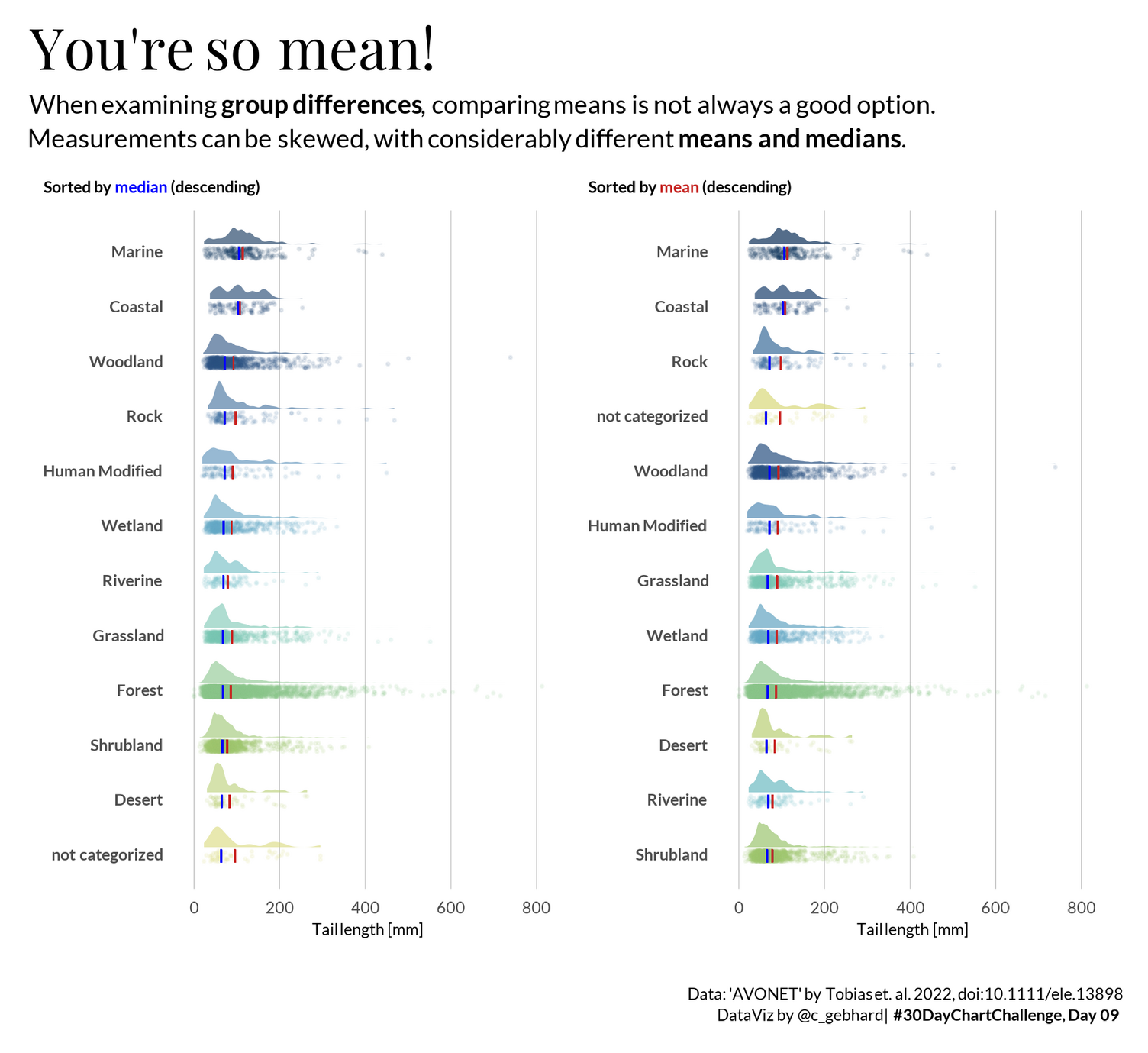 Same AVONET data, comparing means and medians. Comparing the groups with either parameter makes a considerable difference in ranking.