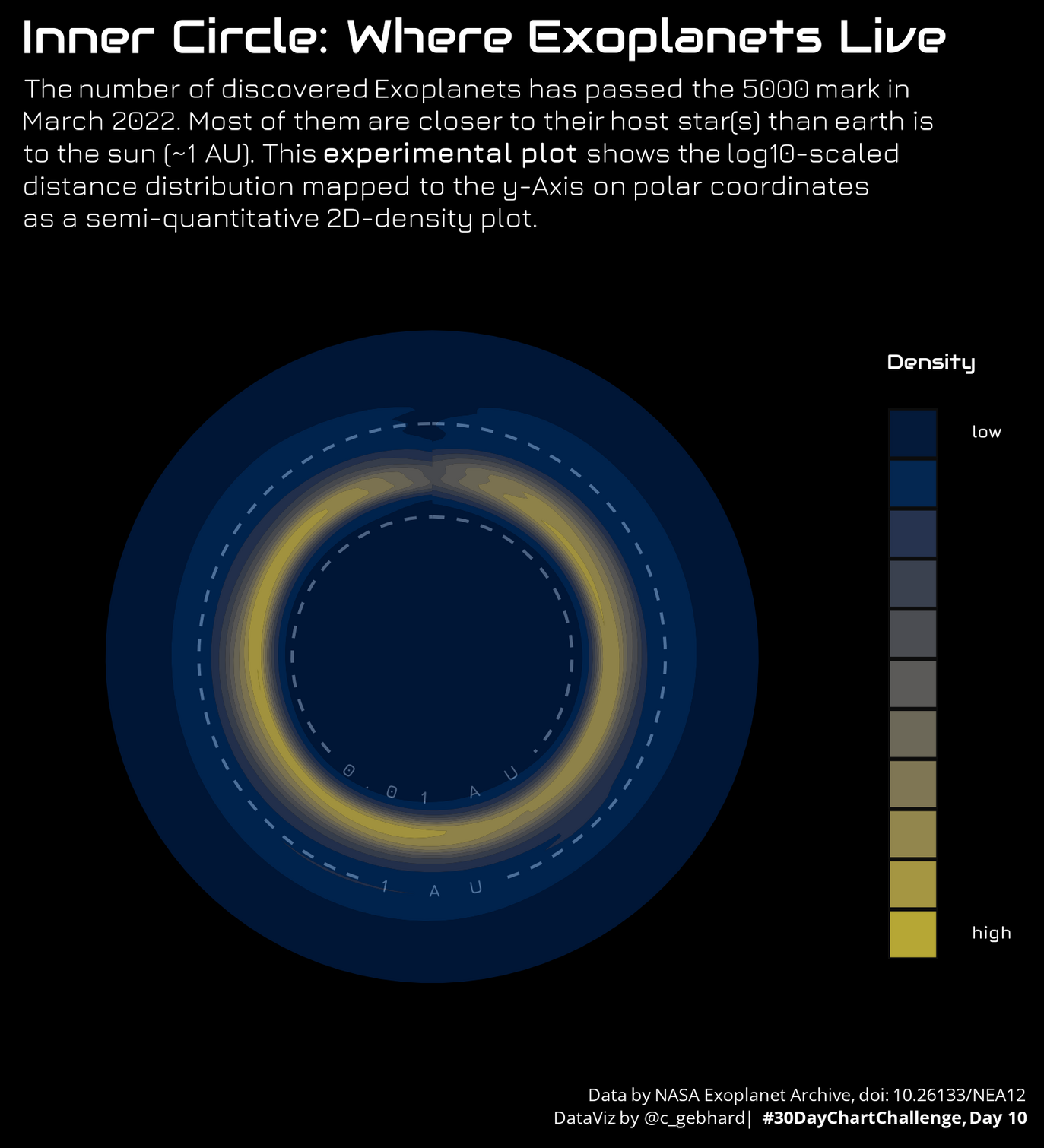 Distance of exoplanets to their host star(s). This plot is experimental & oversimplifies. The struggle was the highly skewed distance distribution, so a log scale was necessary, which conflicts with the assumed center/zero of the circle.